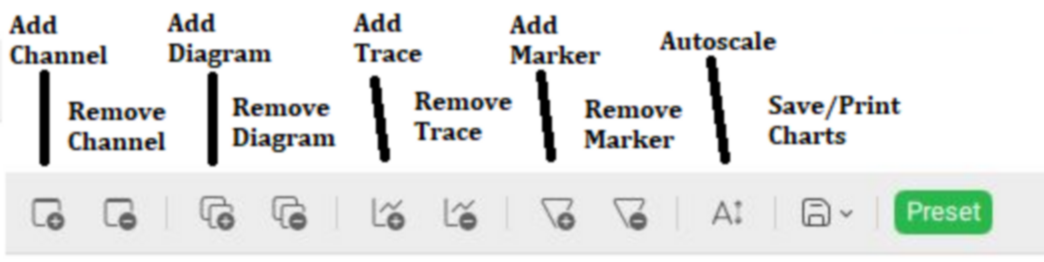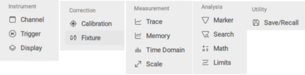 The menu is divided into sensible sections: Instrument, Correction, Measurement, Analysis, and Utility]. Frequently used functions, such as adding new traces, markers or diagrams, are implemented as buttons along the top of the UI.